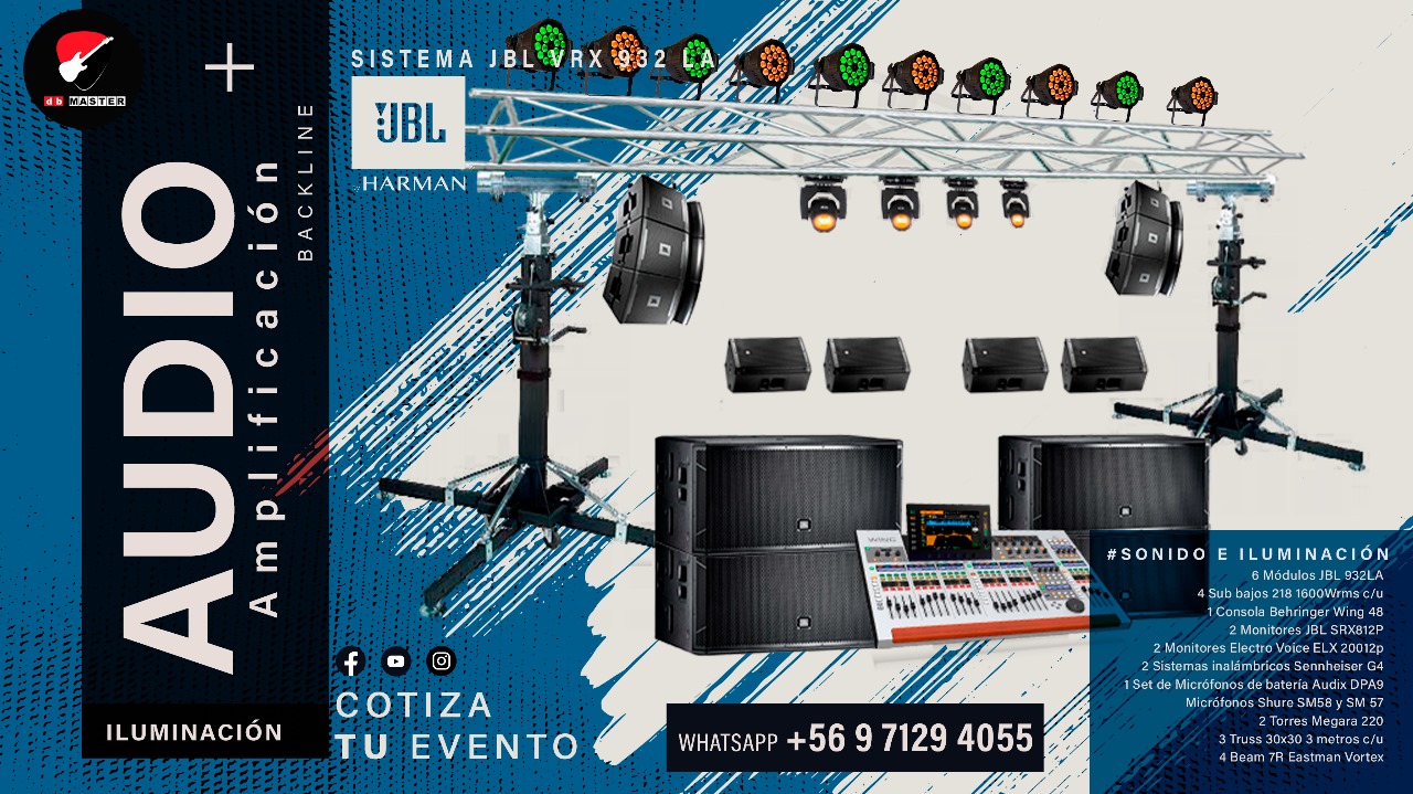 Amplificación e iluminación ideal para eventos de aproximadamente 1000 personas, para reproducir música o para música en vivo. El precio es neto (si necesita factura se le suma el iva), para eventos en Temuco (en caso de ser fuera de Temuco hay que sumar el traslado.
